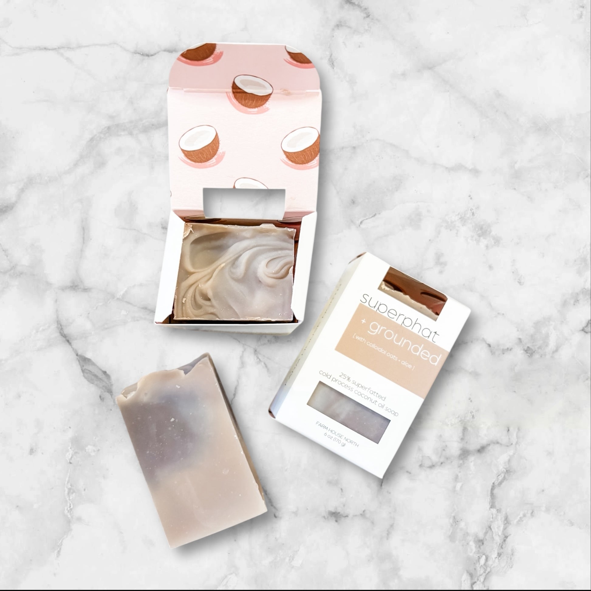 Superphat + Grounded: Sandalwood + vanilla intertwined for a warm calming and grounding scent. Added aloe + colloidal oats which are amazing for your skin.